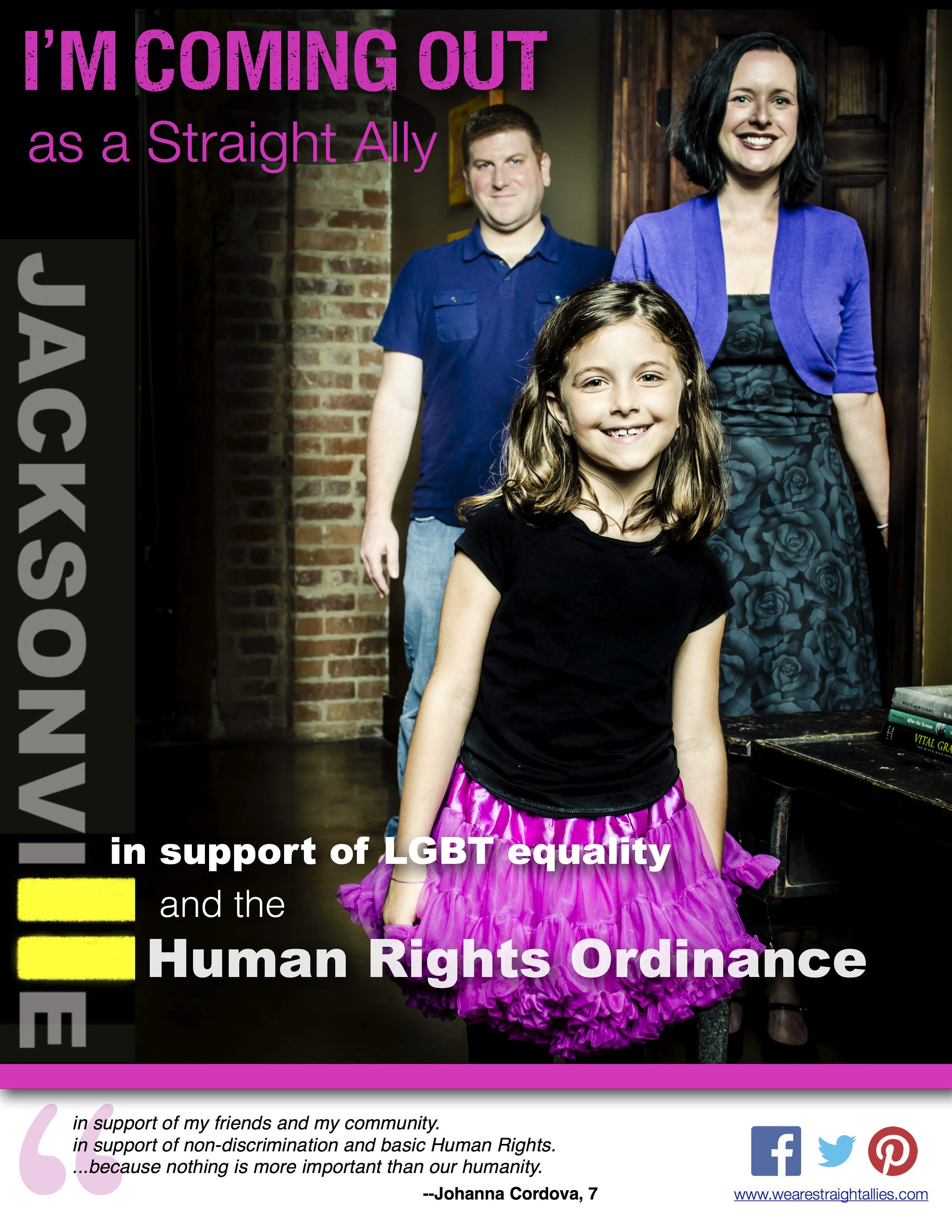 “It’s not enough to have the Supreme Court strike down DOMA and declare gay marriage to be legal. We still live in a city and a state that says there is a subset of our society that is “less than” and does not provide them protection from discrimination or the equal rights they deserve. If the laws are ever going to change, more straight families need to stand in support of LGBT rights. We are allies because we want to live in a world where the core values we raised our daughter on aren’t just flowing words without meaning. We want to believe that we live in the land of the free where all people are created equal. That those too aren’t just flowing words without meaning. For this reason we gladly lend our voices to the growing chorus of opposition in this fight.”